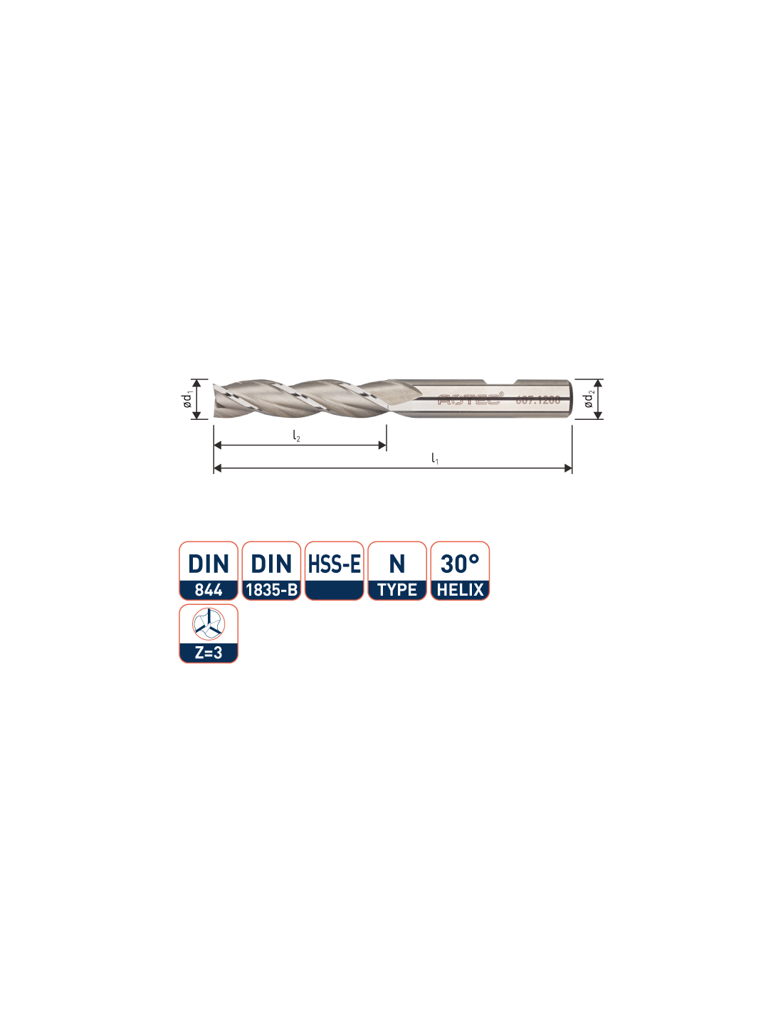 Lang model volgens DIN 844, type N, spiraalhoek 30°, cilindrische schacht met weldonvlak volgens DIN 1835-B.