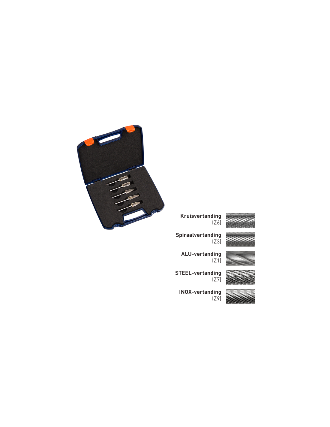 Set stiftfrezen (5-dlg.) in ABS-koffer 5-dlg. set stiftfrezen ø9,6 mm, kruisvertand (Z6) 1x model B,C,F,G en L per 1 BF-900.3066 View